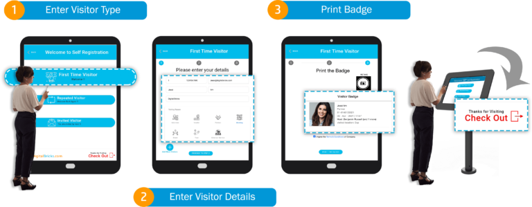 A first-time user on arrival can use the badge printer to avoid the queue in front of the reception. The basic details are entered and the host’s name, images are captured in real-time, and once done badge is printed, and also the host will be notified on the arrival of his guest.
