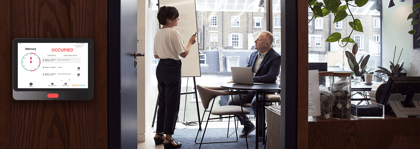 Its as smart interactive display which can be fixed outside of any room/office, which can be used to book, cancel, extend or release meetings and also explore nearby rooms availability.